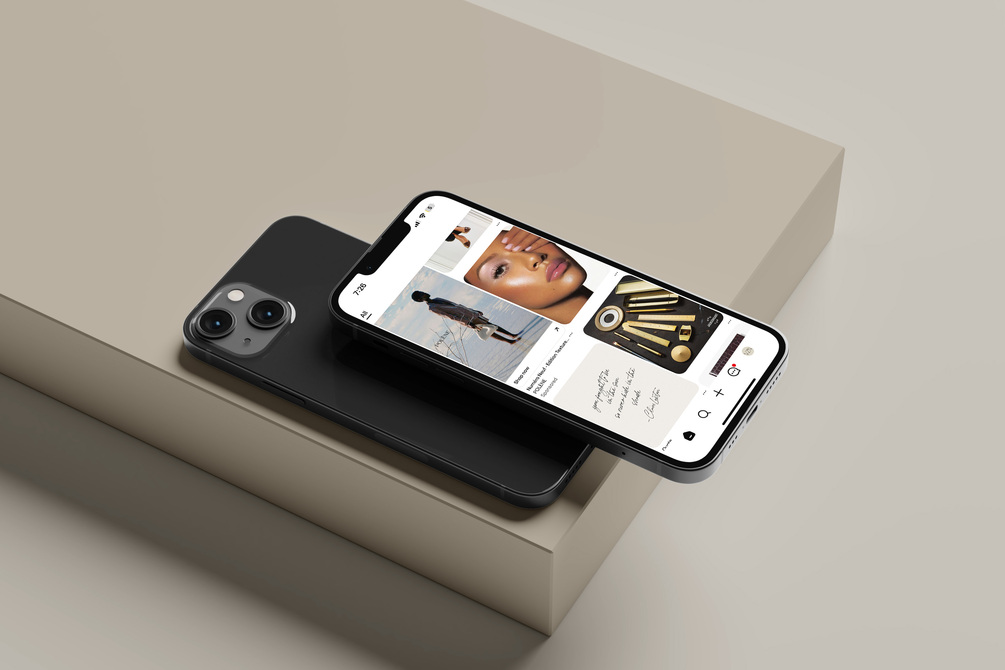 Showcase your digital content with precision and elegance using this sleek iPhone mockup. Featuring a minimalist top-down composition, this scene includes one phone lying flat and another angled screen-up, ideal for displaying app interfaces, Pinterest mood boards, social media, or beauty and fashion content.